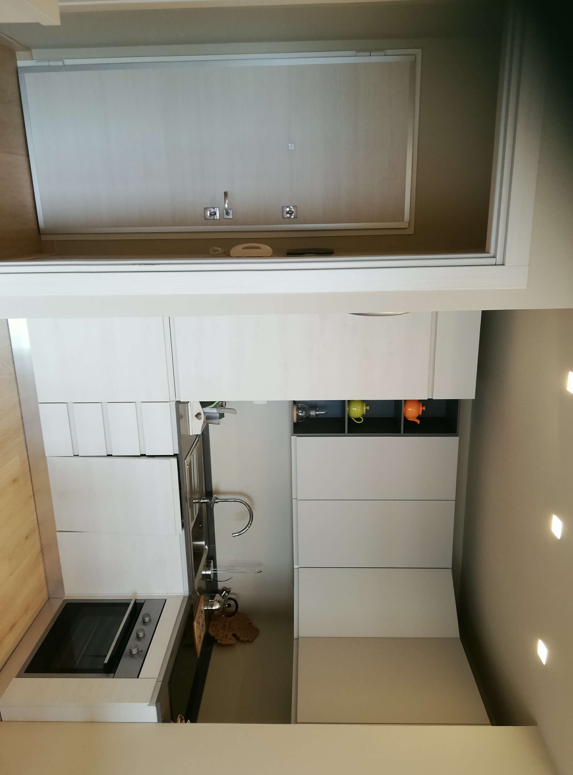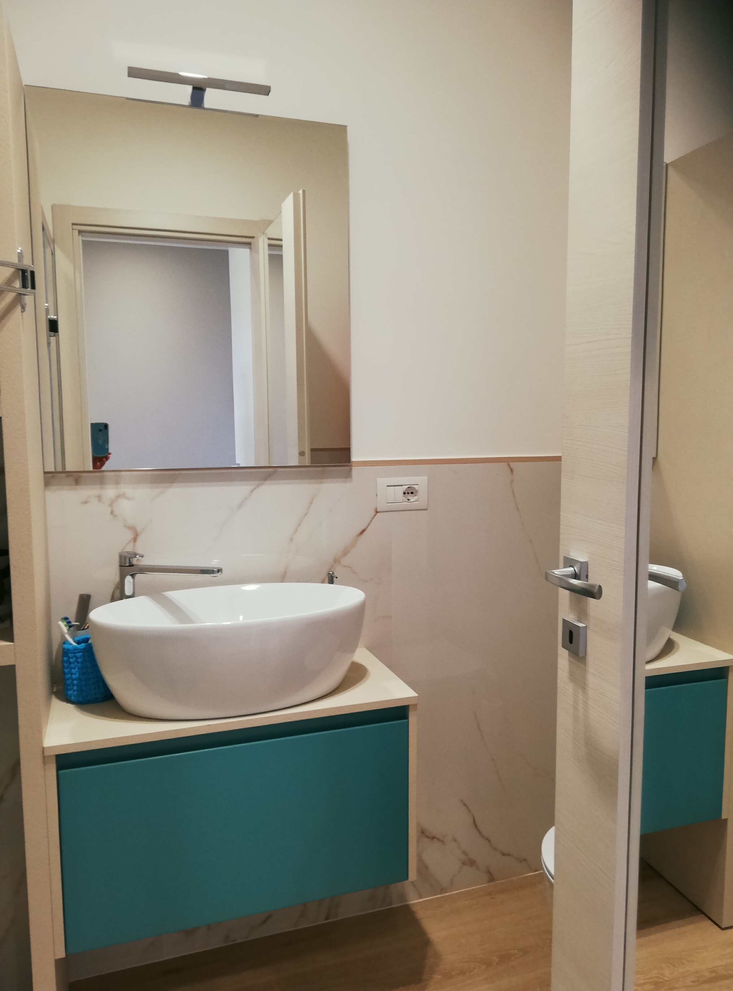 In un complesso signorile risalente agli anni '70 del secolo scorso, un piccolo bilocale viene completamente rivisto in chiave contemporanea, creando un ampio living con zona cottura collegato al balcone esterno vista mare, mentre un piccolo disimpegno di ingresso distribuisce la camera ed il bagno. Protagonisti ovunque i grandi formati: per i listoni di parquet in rovere per i pavimenti ed il grès a imitare il marmo calacatta per il rivestimento del bagno.