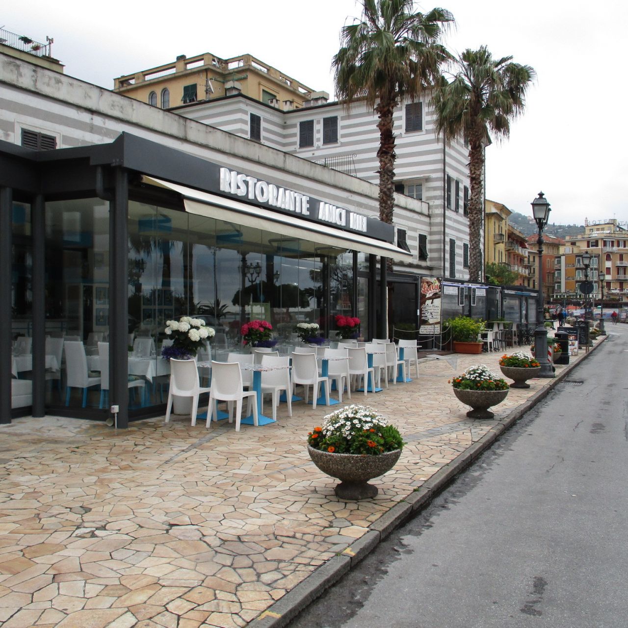 Il ristorante danneggiato da una terribile mareggiata, è risorto a nuova vita in pochi mesi. Il progetto, caratterizzato da forme rigorose e lineari, sembra dialogare con la casa storica e con l'architettura razionalista del primo Novecento, l'epoca in cui proprio in località rinomate come Rapallo nasceva il turismo internazionale. La nuova veranda vetrata si caratterizza per la separazione tra la struttura delle colonne cilindriche ed i serramenti che, nel fronte verso il mare, con un particolare sistema di movimento, consentono l'apertura completa del locale verso l'esterno.